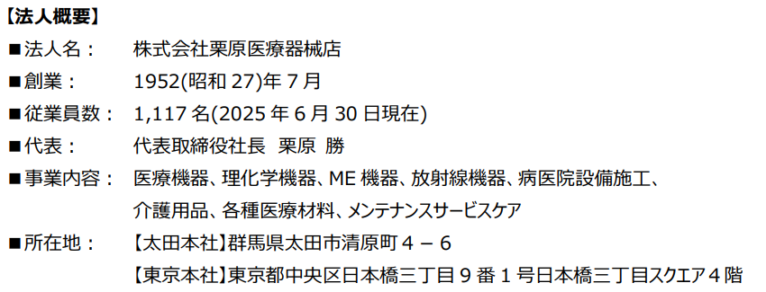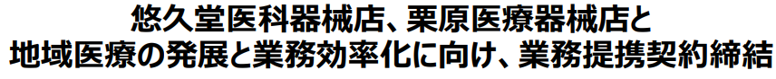 株式会社悠久堂医科器械店(本社︓新潟県長岡市、代表取締役社長︓加瀬 宗一郎、以下「悠久堂医科器械店」)は、株式会社栗原医療器械店(本社︓群馬県太田市、代表取締役社長︓栗原 勝、以下「栗原医療器械店」)と業務提携契約を本日締結したことをお知らせします。